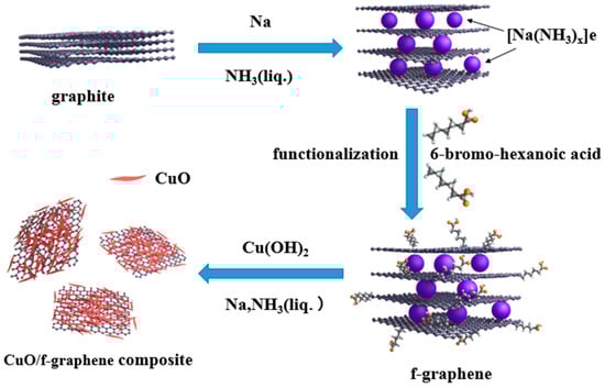 The CuO/f-graphene composite was successfully synthesized via a one-pot chemistry method. The f-graphene was prepared through the Birch reduction chemistry method to yield “–(CH2)5COOH” groups and the detailed processes were shown as follows [32]: firstly, liquid ammonia (70 mL) was cooled with the mixture of ethanol (95%, Greagent, Chengdu, China) and dry ice in a 250 mL flask. Then graphite (50 mg) and sodium (145 mg, Acros, Shanghai, China, 98.8%) were added into it. After continuous stirring for 20 min, 6-bromo-hexanoic acid (1.625 g, Adamas, Shanghai, China, 98%) was added and stirred for about 50 min. To achieve highly functionalized graphene, sodium, and 6-bromo-hexanoic acid were added three times in turn. After that, sodium (200 mg) was added into the flask to react for 10 min before Cu(OH)2 (105 mg, Greagent, Chengdu, China) was added and reacted for 50 min. The mixed solution was stirred overnight. After the liquid ammonia evaporated completely, the product in the flask was transferred and mixed with hexane, and then washed by NaOH solution (pH = 11) three times to remove impurities. Finally, the CuO/f-graphene composite was dried at 60 °C overnight. The schematic of the synthesis procedure of the CuO/f-graphene composite is depicted in Scheme 1. For comparison, the f-graphene sample was synthesized without adding Cu(OH)2, and the pure CuO material was synthesized by the same method without adding graphene.