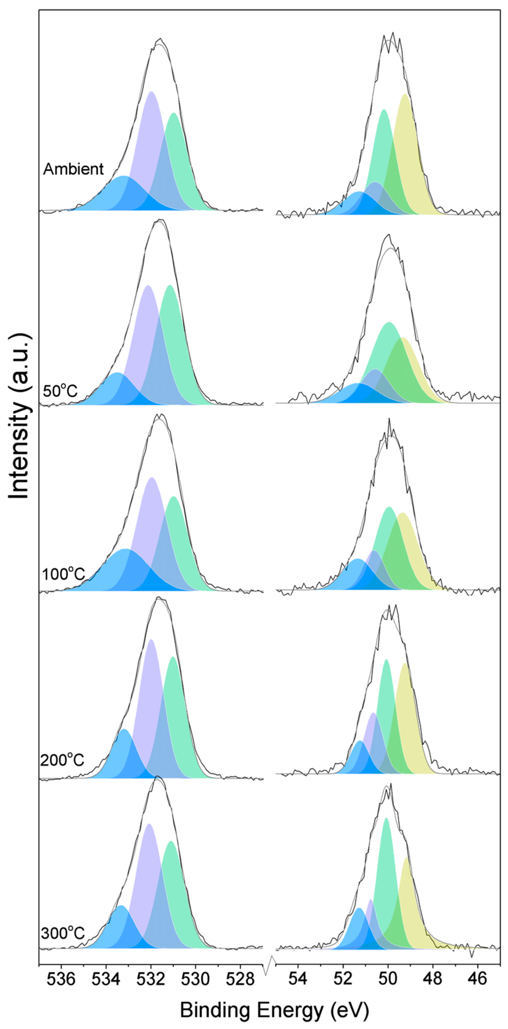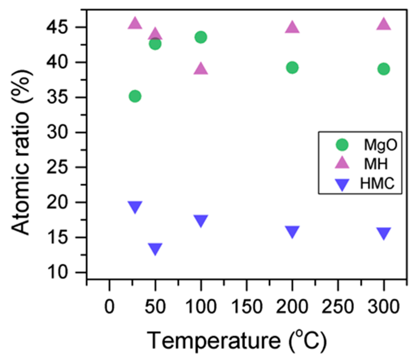 When the samples are subjected to high temperatures, it is observed that the Mg2p peak related to metallic Mg shifts by 0.2 eV to a higher BE but soon fluctuates down to the initial BE. Simultaneously, the peak related to MgO shifts to a lower BE (50.2 to 50.0 eV), and this increases again when the samples are subjected to temperatures higher than 100 degrees; however, the BE is still lower than the initial BE by 0.1 eV, and the Mg(OH)2 peak shows a 0.2 eV shift to a higher BE only when the temperature is at 300 °C. The peak at a higher BE, related to the magnesium carbonates, does not exhibit any significant change in terms of BE. In the literature, samples heated to high temperatures, however, present abnormalities on the adventitious carbon peak, which end up inducing errors on the BE of the magnesium peak [47,48,49]. These studies correct the charging effect by using alternative peaks, usually the O1s peak, when it originates only from the native oxide; however, this cannot be ensured here. Therefore, the Mg2p BE here cannot be considered as stand-alone information on the chemical state of the elements, and it is analyzed together with the concentration, FWHM, and the other components present in the sample.