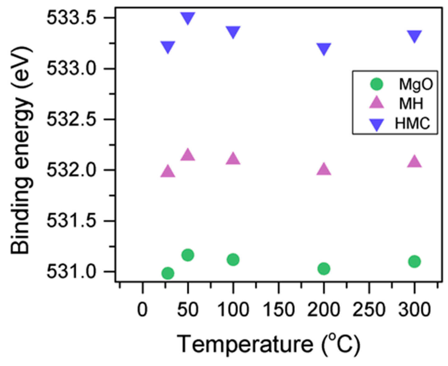 - Increases in temperature led to the transformation of nesquehonite into hydromagnesite, as indicated by the changes in the BE of the O1s peak. This was eventually followed by the conversion of hydromagnesite into magnesite. The atomic ratio of the carbonates fluctuated without significant changes, as decarbonation is expected to only start at higher temperatures. Decreases in the FWHM indicated changes in the oxygen bonding. Four components were observed for Mg2p in all samples, which are related to metallic Mg (which can be trapped inside particles from the precursor), MgO, MH and HMCs. Their BEs could not be evaluated alone due to abnormalities in the adventitious carbon peak observed in the literature for samples heated to elevated temperatures, and instead, the BEs were analyzed together with the concentration, FWHM, and the other components present in the sample.
