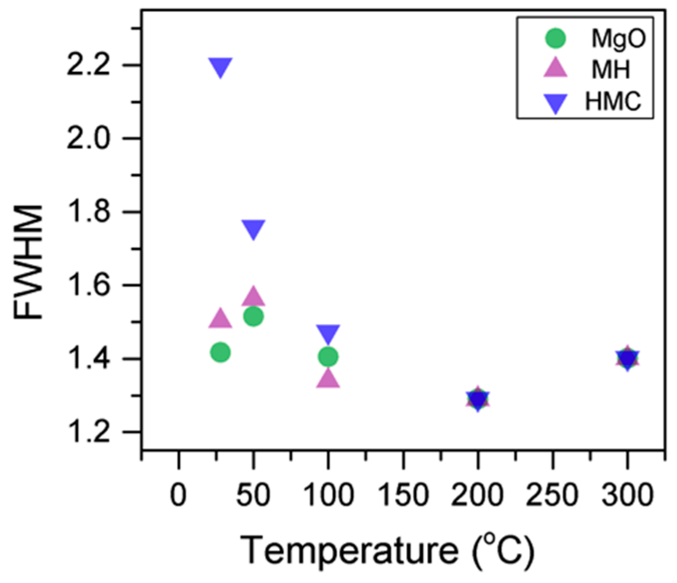 Here, the FWHM reduces significantly for the all the elements, which indicates changes in the chemical state; in particular, in magnesium hydrates, where the decrease is more significant, the reduction in the FWHM indicates the decomposition of these components (Figure 5). At the same time, the amount of MgCO3 in the samples fluctuates as the temperature increases, as there is not much decarbonation within this range; moreover, the other components do not provide significant information on the atomic ratio.