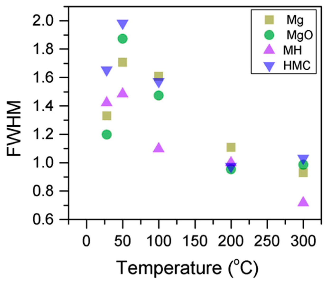 There is a C1s signal at approximately 290 eV (not presented here) due to carbon-oxygen bonding, which may be O–C=O. It is known that the carbon atoms in the magnesite phase are threefold-coordinated carbon atoms with triangular CO2− ions with sp2 bonding [50], which is likely observed here. Feliu et al. [21] in their experiments involving the exposure of pure Mg to an ambient environment with high humidity, also describe observing hydration and carbonation and associating peaks at approximately 290.3–290.8 eV to magnesium carbonates. Here, all of the samples that are either subjected or not subjected to high temperatures gradually present the same peak at approximately 289.8 eV, which is related to magnesium carbonates, and no significant differences in the FWHM value are observed.