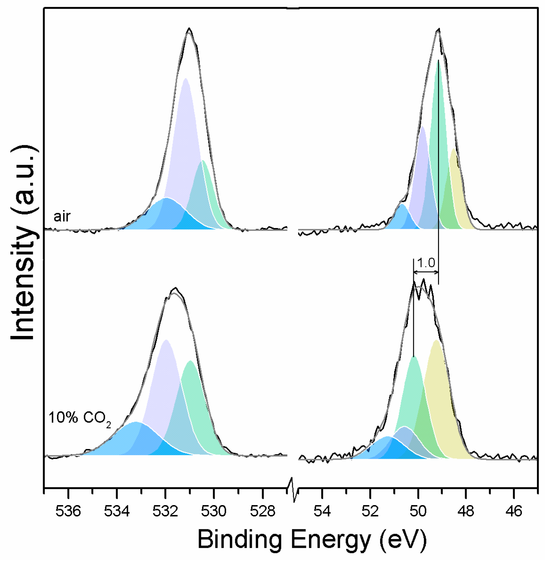 O1s (left) and Mg2p (right) peaks for samples exposed to air and 10% CO2.