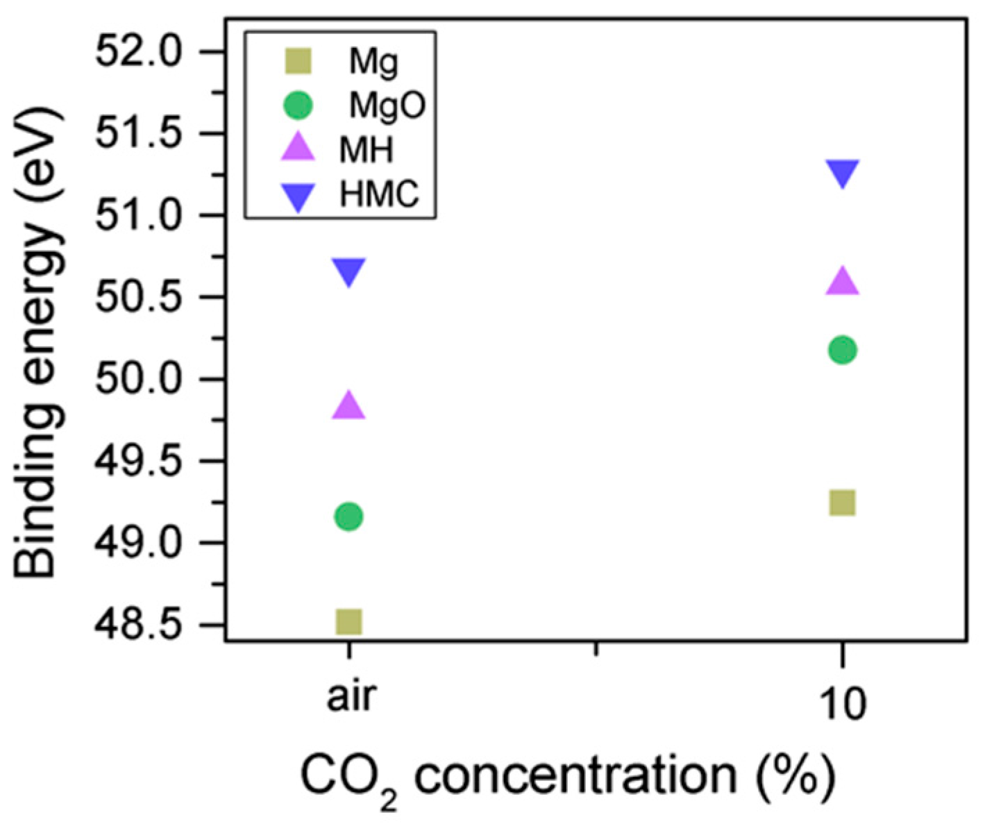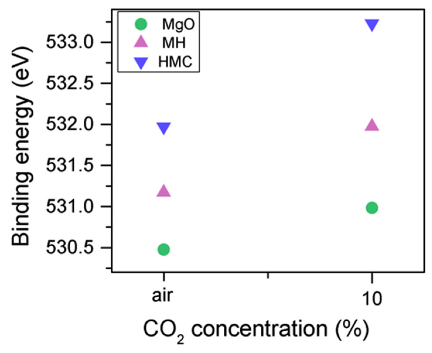 - Increases in the BE of C1s and O1s as the CO2 concentration increased indicated the formation of carbonate phases. At high energies, the Mg2p peak (related to the carbonates) was extremely small for the sample exposed to only air, which demonstrated the effect of the carbon concentration on the formation of HMCs. Agreements between the C1s and O1s peaks were observed via the increases in BE with the concentration (from air to 10% CO2), while the magnesium hydrates peak shifts and the amount of carbonates increase significantly, together with an increase in the FWHM of the carbonated species.