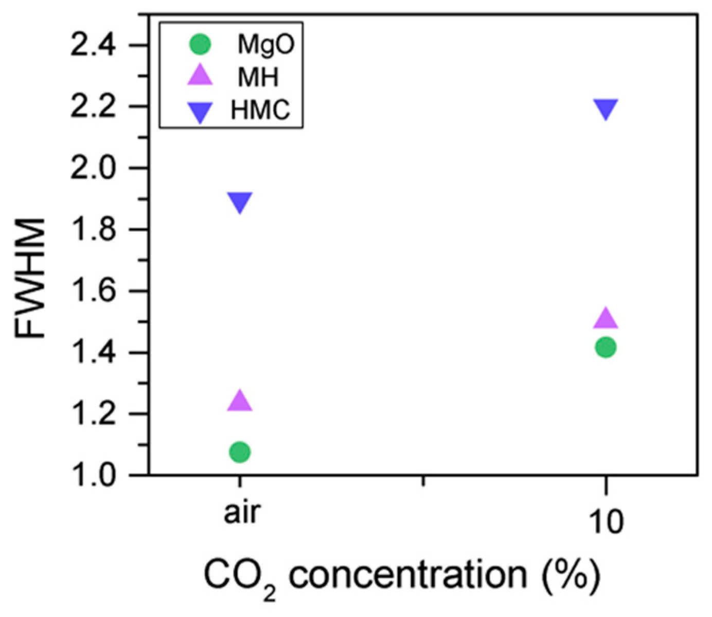 The C1s peak (not presented here) indicates differences when the sample is exposed to CO2 instead of air: an increase of the BE by 0.8 eV is observed (from 289.0 to 289.8 eV), which is accompanied with a decrease of the FWHM by 0.8 eV. On the other hand, the O1s peaks shift by 0.2 eV to higher BEs, which also indicates the formation of magnesium carbonates; the magnesium hydrates peak shifts from 531.8 to 532.0 eV (Figure 9), while the concentration of carbonates increases significantly (Table 5), with a large increase in the FWHM of the carbonated species (Figure 10).