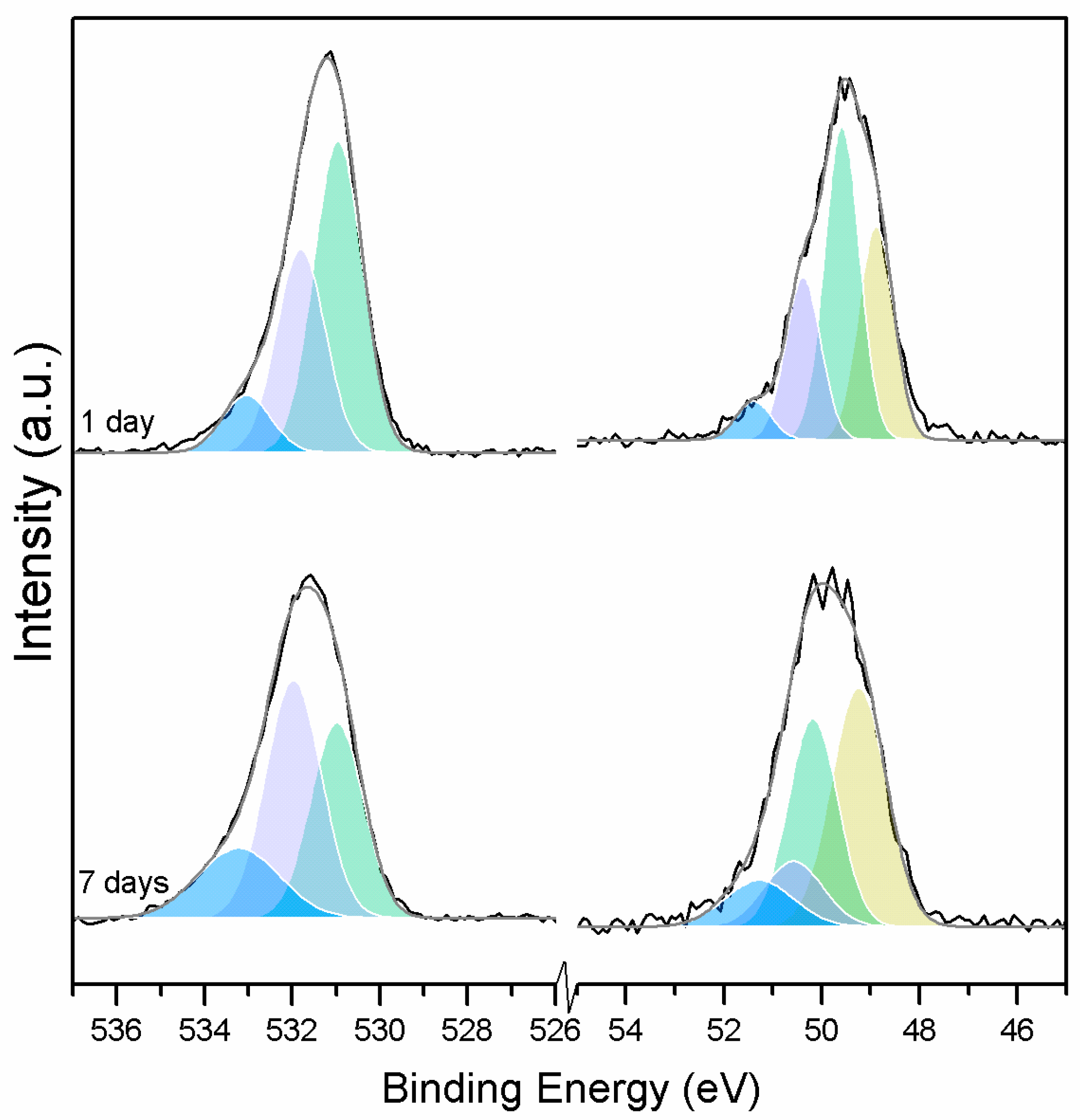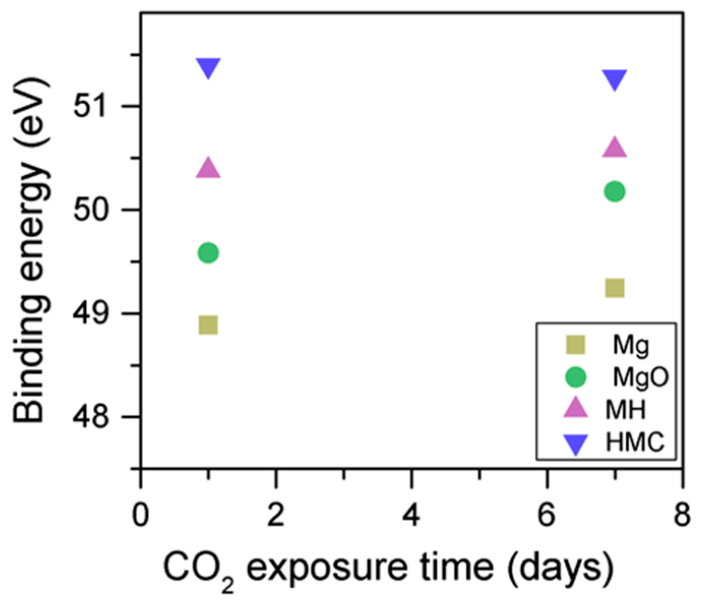 When samples exposed to CO2 for one and seven days are compared, a clear change is observed in the Mg2p peaks related to metallic Mg, periclase, and magnesium hydrates (Figure 11); a shift to a higher BE is observed, which indicates the formation of hydrates and carbonates. The metallic Mg peak shifts by 0.3 eV towards a BE closer to MgO. The BE of the MgO peak increases by 0.6 eV towards the BE of the magnesium hydrates, and the peak for the magnesium hydrates increases by 0.2 eV in the direction of the BE of the magnesium carbonates. However, no significant changes in BE are observed for the peak at higher BE, which is related to the carbonates (Figure 12).