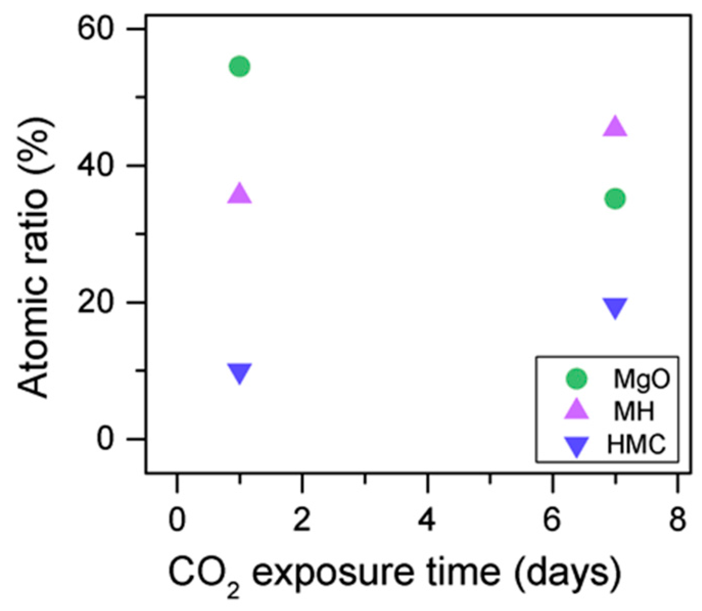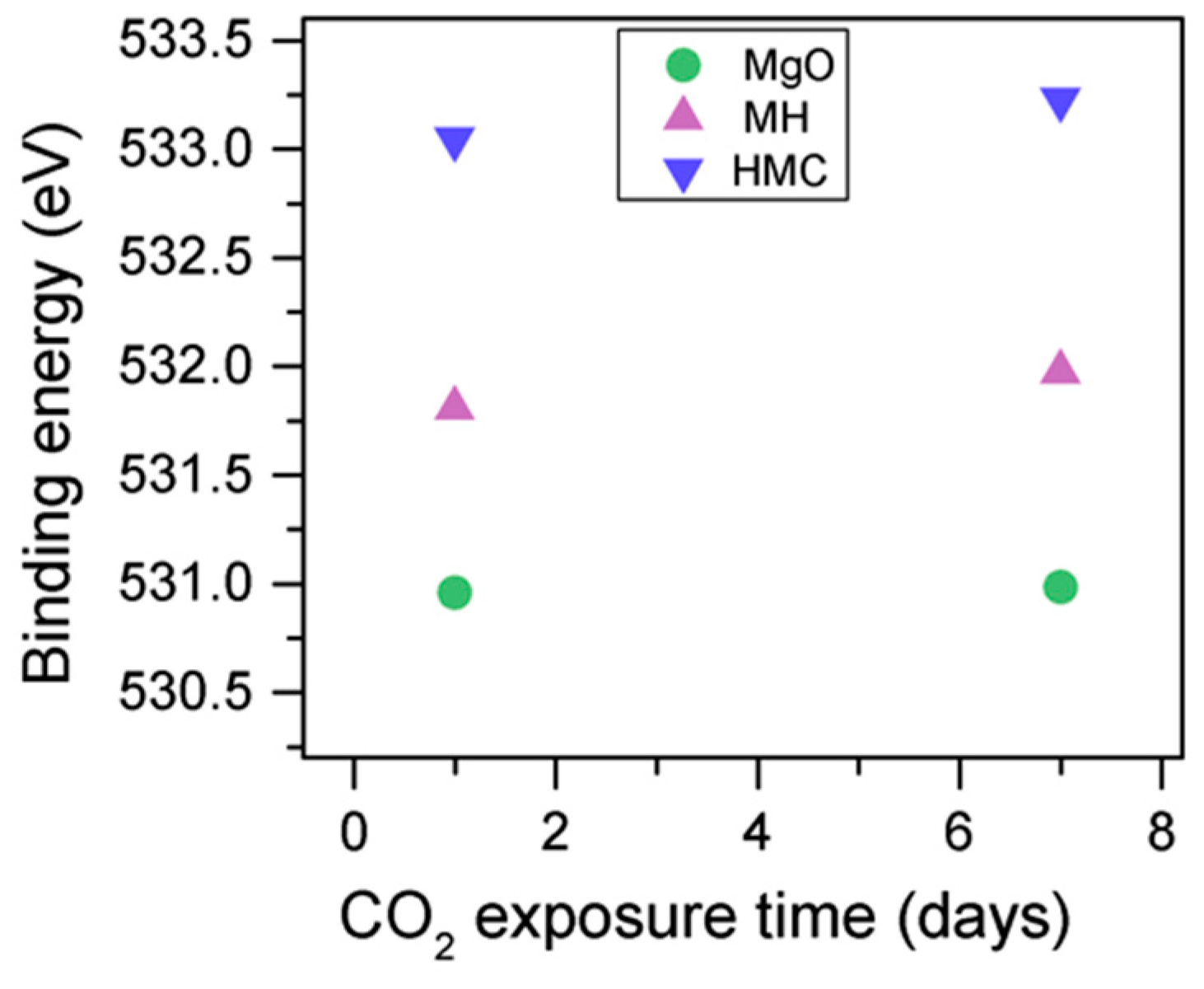 - An increase in the CO2 exposure time from one to seven days was demonstrated via shifts of all components to higher BEs. This was accompanied with the decrease of the concentrations of periclase and the hydrated components and the increase in the concentration of carbonates, which indicated the continuous formation of hydrate and carbonate phases for longer exposure times.