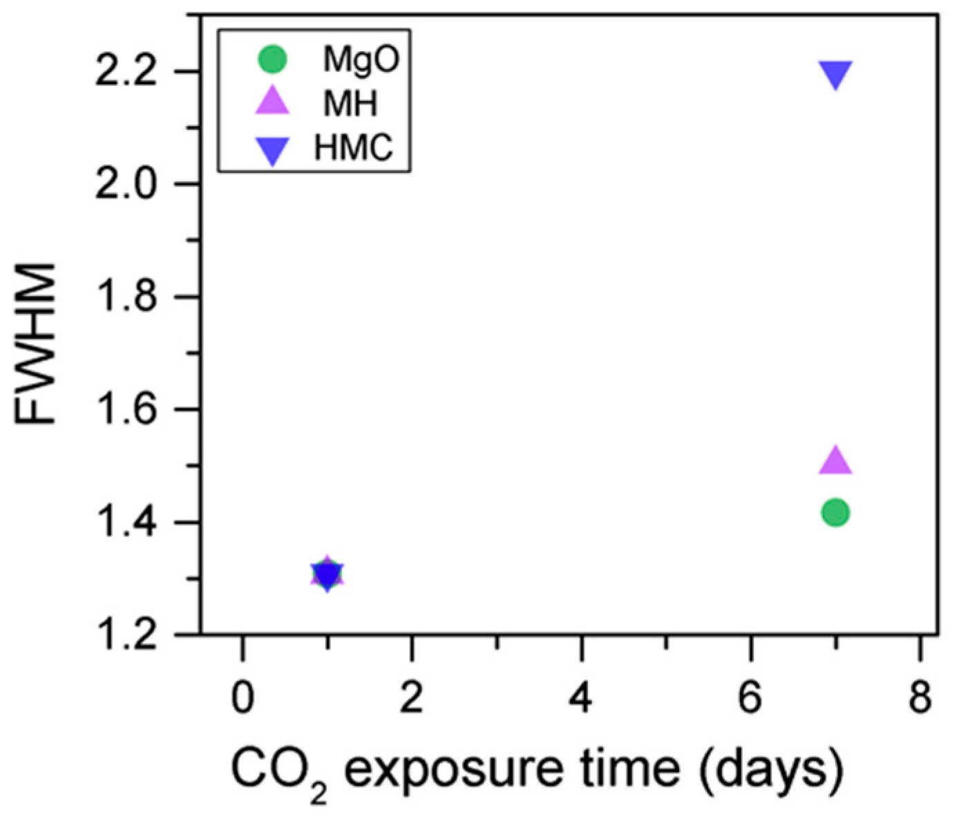 Simultaneously, the decrease in the concentration of periclase and the hydrated components, along with an increase in the concentration of carbonates, again confirms the formation of these elements in the samples as the exposure time increases (Figure 13). Similarly, the FWHM values for all components increase after the exposure to CO2; however, the peak related to the carbonates presents significantly larger changes, almost duplicating its FWHM values (Table 6).
