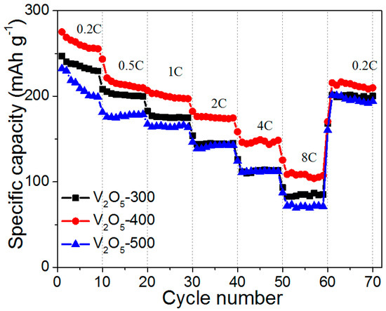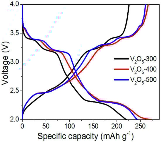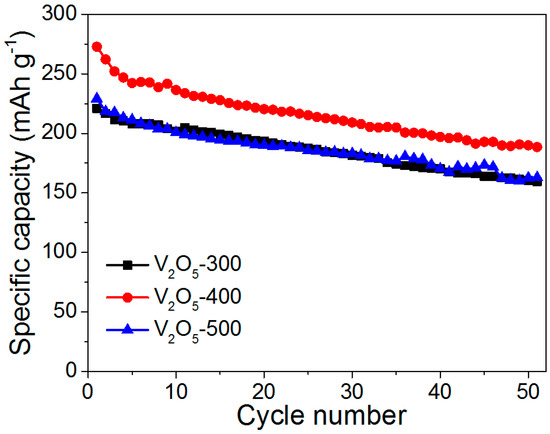 - Kim, T.; Shin, J.; You, T.-S.; Lee, H.; Kim, J. Thermally controlled V2O5 nanoparticles as cathode materials for lithium-ion batteries with enhanced rate capability. Electrochim. Acta 2015, 164, 227–234. [Google Scholar] [CrossRef]