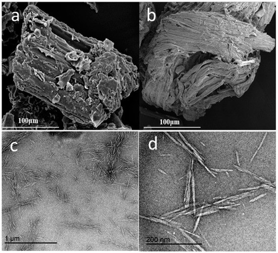 Figure 1. SEM micrographs of (a) the raw material and (b) the extracted cellulose; (c,d) transmission electron microscopy (TEM) micrographs of the cellulose nanocrystals (CNCs) isolated from the corn stalk.