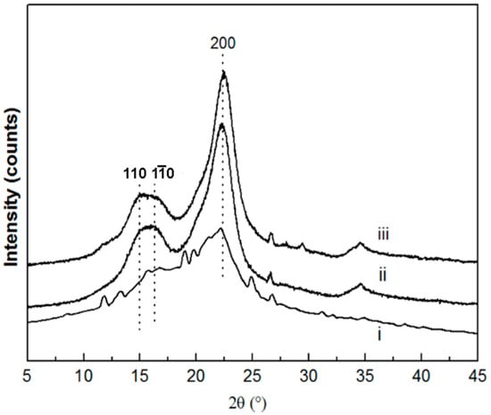 Figure 2. X-ray diffraction patterns of (i) the raw material; (ii) the extracted cellulose; and (iii) the CNCs.