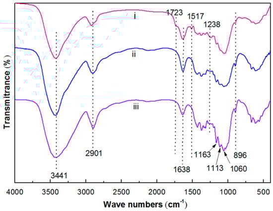 Figure 3. Fourier transform infrared spectroscopy (FTIR) spectra of (i) the raw material; (ii) the extracted cellulose; and (iii) the CNCs.