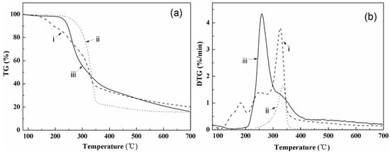 Figure 4. (a) Thermo-gravimetric (TG) and (b) Derivative TG curves of (i) the raw material; (ii) the cellulose; and (iii) the CNCs isolated from the corn stalk at a heating rate of 5 °C/min.