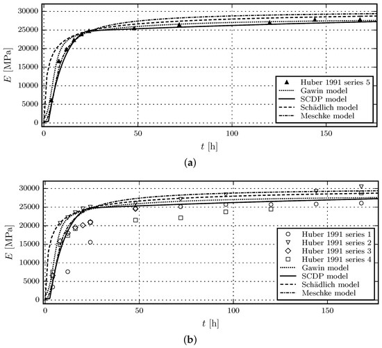 Figure 1b shows a comparison of the evolution of the Young’s modulus employing the original volume function and the modified volume function. The compliance parameters, identified from test series 5 in [15], are , and (all in 10−6 MPa−1) and the effective Young’s modulus at the age of 1 day is computed for a time period of as 24,780 MPa. In addition, in Figure 1b, the experimental results for test series 1 to 4 in [15] are shown, which serve for validation of the proposed approach.