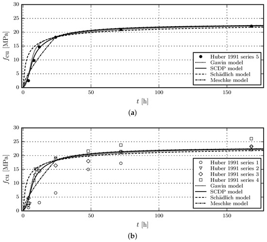 Evolution of the uniaxial compressive strength: (a) Results of the calibration of the shotcrete models based on test data of test series 5 by Huber [15]; (b) Validation of the shotcrete models by means of the data of test series 1 to 4 in [15].
