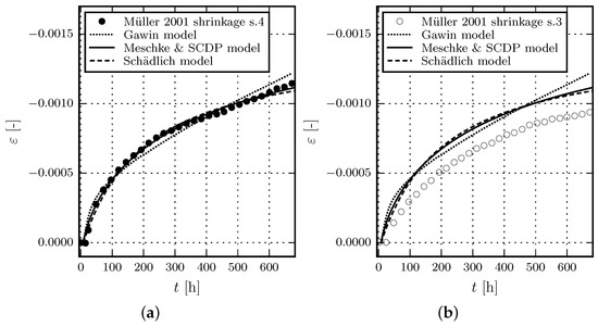 Evolution of the total strain in shrinkage tests: (a) Results of the calibration of the shotcrete models based on test data of test series 4 by Müller [17]; (b) Validation of the shotcrete models by means of the data of test series 3 in [17].