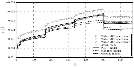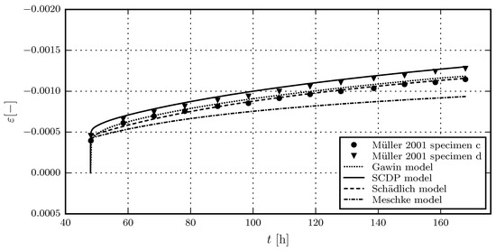 The creep parameters of the three models are exclusively identified from test series 4/2, and are subsequently used to simulate test series 3 and 4/1. The Young’s modulus at the age of one day, , is specified in [17] as = 7690 for test series 4. The Young’s modulus at the age of 28 days, , is computed as the mean value of the two values presented in [17] as = 11,580 MPa. The uniaxial compressive strength at the age of one day is reported as = 8.72 and the compressive strength at the age of 28 days was measured in tests series 4 on three specimens, from which the mean value is computed as = 16.8 .