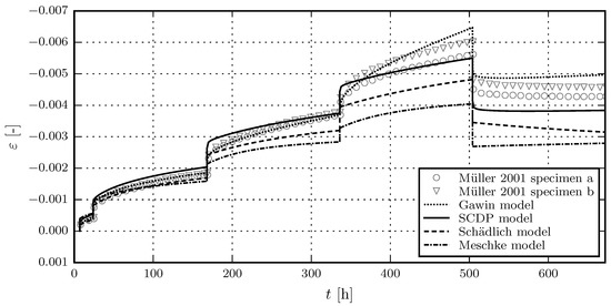 The presented numerical results for the Meschke model, the Schädlich model and the SCDP model are obtained at material point level, prescribing the stress in incremental-iterative simulations based on the respective stress update algorithms. The evolution laws within the framework of plasticity theory are integrated by means of the fully implicit Euler backward scheme within the return mapping algorithm. The evolution laws for creep behavior of the SCDP model and the Gawin model within the framework of viscoelasticity are approximated by Kelvin chains, and are integrated based on the exponential algorithm as proposed in [40]. The respective coefficients of the Kelvin chains are determined from the retardation spectra of the creep compliance functions as presented in [41].