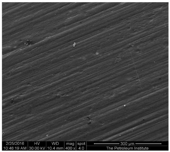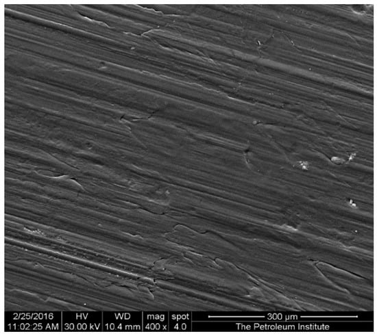 Nanocomposites consisting of 5 wt % TiO2 were developed at a fixed barrel temperature of 250 °C, with varying residence time of 30 min, 50 min, and 70 min. It was observed that residence time as an independent variable does not affect the surface morphology of the injection molded nanocomposites. Figure 2 is a representative micrograph prepared at 30 min residence time. The surface of the samples is dominated by apparent ridges. In agreement with the observations, Mozumder et al. [] confirmed the presence of nano-topographies consisting of groves and numerous concavities all over the polymeric surface. Also, Shi et al. [] examined polymeric surfaces by SEM and confirmed the presence of micro-sized titanium dioxide particles on a smooth polymeric coating; other studies by the group also supported these observations [,,]. Ranjusha et al. [] processed hybrid composites at two different barrel temperatures (180 °C and 190 °C) during injection molding, and their findings concluded that the temperature had little effect on the overall morphology of the composites [].
