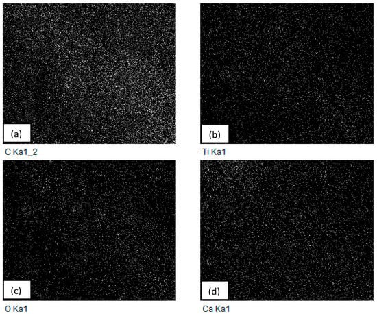 Figure 4a–d shows that the carbon content is much higher than the other elements. Titanium elemental mapping resulted in a uniformly distributed image with titania particles dispersed all over the nanocomposite surface. Similar results were achieved by Mozumder et al. [] in which the polymeric powder coatings (PPC) resulted in an even distribution of micrometer-sized titanium across the different surfaces. Also, Wang et al. [] confirmed the presence of titanium through point EDS analysis, resulting in the successful incorporation of the filler. Other elements such as oxygen were also present since titanium dioxide was the filler component and the presence of calcium was observed in significant amounts as it is a common additive found in commercial grade metal oxides.