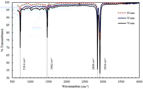 Fourier transform infrared (FTIR) spectra of injection molded HDPE/TiO2 nanocomposites at 5 wt % TiO2 and a barrel temperature of 250 °C. Residence time was varied at 30 min, 50 min, and 70 min.