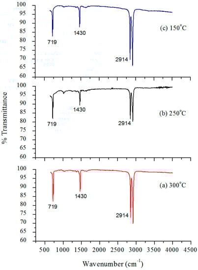 FTIR spectra of injection molded HDPE/TiO2 nanocomposites at 5 wt % TiO2 and residence time of 50 min. Barrel temperature was varied at: (a) 300 °C; (b) 250 °C; and (c) 150 °C.