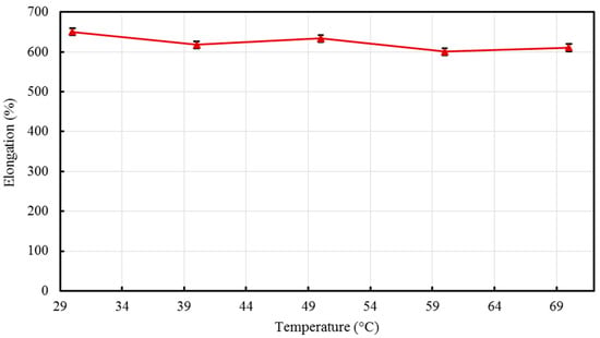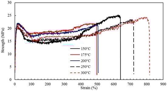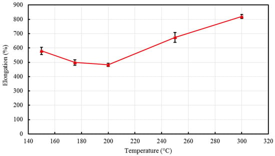 The percent elongations, representing the ductility of the material were obtained and are demonstrated in Figure 10. At 150 °C, the elongation of the composite was found to be ≈580%, while at 200 °C the elongation observed had a slightly lower value ≈482%. This could be explained by the presence of laminar orientation occurring at low temperatures that resulted in higher ductility, this result was also observed by Zhang et al. [] in which PP/LLDPE composites revealed higher percent elongation at a low melt temperature (barrel temperature).