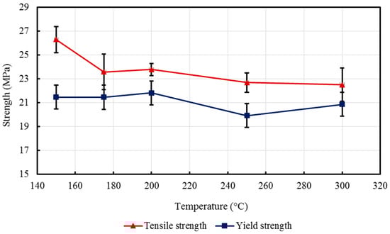 The tensile strength demonstrates the same trend modulus and yield strength, with a highest value of 24.25 MPa and a lowest value of 21.60 MPa.