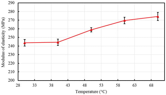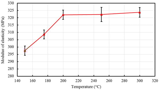 Young’s modulus, which represents the stiffness of the material was calculated from the initial linear region of the stress-strain curves, the average values of three samples were considered and are shown in Table 1 and presented in Figure 9, with SE bars. The moduli of the nanocomposites were found to have little variation and were observed to increase with barrel temperature; a total increase of 8.81% was shown when the barrel temperature increased from 150 °C to 300 °C. Tripathi et al. [] also studied HDPE composites incorporated with alumina and hydroxyapatite that were fabricated using injection molding at 180 °C (see Table 1). The mechanical tests revealed that the minimum modulus of elasticity occurred with neat HDPE and consistently increased at higher filler concentrations.