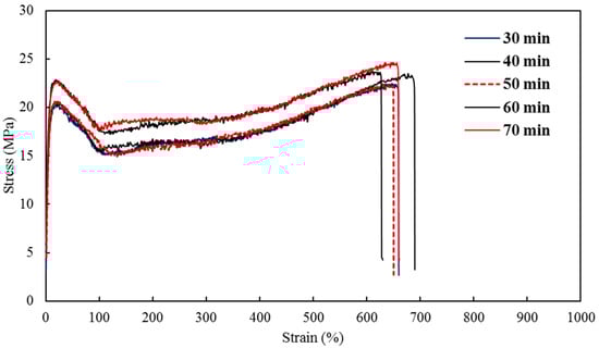 The percent elongation values of the composites vary within a range of 49.4% (see Figure 14) with residence time, which is relatively a narrow range. In light of the above results, it can be concluded that the considered range of residence time (30 min to 70 min) has a minor effect on the mechanical performance of HDPE/TiO2 nanocomposites.