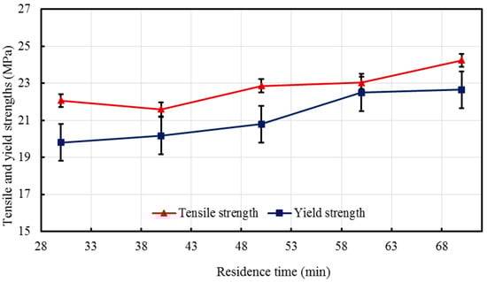 Figure 13 demonstrates the variation of the yield and tensile strengths with barrel residence time. The same slow increasing trends analogous to that of the modulus of elasticity are observed. The yield strength of the composites varies with a maximum range of 2.85 MPa, showing negligible variation when the residence time was altered.