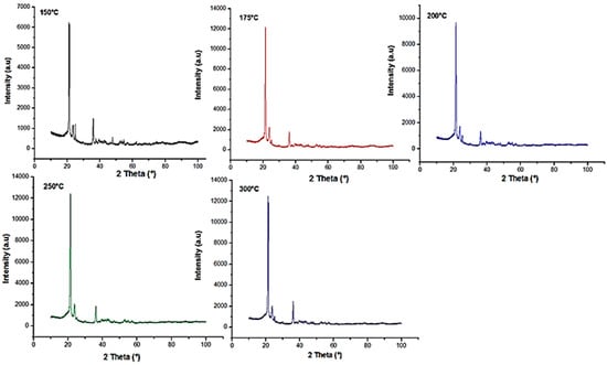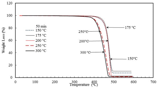 In reference to Figure 5, it can be inferred that, the considered residence time range has no effect on the overall infrared spectra of the nanocomposites, as all the characteristic peaks are well aligned with each other. In addition, the intensity varies in the lower range of the wavenumbers in which 30 min shows the highest transmittance followed by 50 min and 70 min with values of 85%, 82%, and 70% respectively. The decrease in transmittance could be explained by the occurrence of any bond weakening or cleavage when the melted composite mixture remains in the barrel for a prolonged period, nevertheless the spectrum converges along its length []. Figure 6 presents a stacked graph of the barrel temperature samples, and although similar to the trend found in the residence time, a wider range of transmittance is observed at 150 °C (between 68% and 97%).