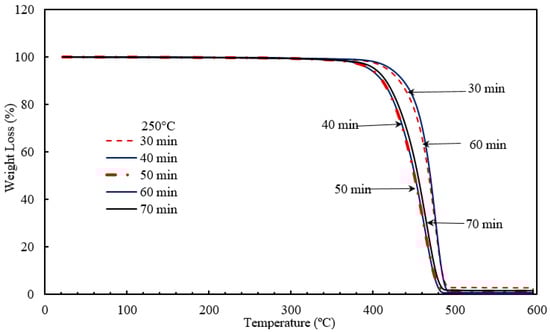The thermograms of the manufactured nanocomposites (BT1-BT5 and RT1-RT5) were taken from thermogravimetric analysis (TGA). Nanocomposites containing 5 wt % TiO2 nanoparticle were injection molded with a different set of barrel temperatures and residence times. The thermograms were obtained by degrading the composites until complete degradation was witnessed As shown in Figure 15 and Figure 16, it can be seen that temperature and residence time affect the TGA. According to Beyler and Bayar et al. [,] the stiffer the polymer, the greater is its melting temperature. However, at higher temperatures the polymer tends to become ductile in nature and the melting temperature starts decreasing and the polymer starts degrading. When a temperature exceeds its withstand point, polymer fragmentation occurs and the polymer decomposes. Heating the polymer below its temperature of degradation and cooling the polymer helps to bind it with the nanoparticles which results in a composite more stiffer in nature. With the escalation of the temperature, polymeric materials lose their stiffness and become more ductile in nature, which in turn affects the thermal stability of the composites. The polymer, when exposed to certain temperatures, undergoes degradation and the interaction between the polymer matrix and nanofiller is changed. On annealing, superior quality nanocomposites are developed, even though a higher degree of the processing temperature has a negative impact on the thermal stability []. Table 3 and Table 4 summarize the results of TGA. As shown in Table 3, the rate of degradation of nanocomposites decreased as the sample was processed through high barrel temperatures. On the contrary, in the case of residence time, the higher duration gave better TGA results. However, with increase in barrel temperature and residence time, the maximum degradation temperature decreased.