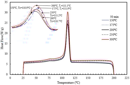 The crystallization and melting behavior of HDPE-TiO2 nanocomposites were evaluated in a TA instrument (Model Q 200, TA Instruments, New Castle, DE, USA). Throughout the experiment, the system was maintained in a nitrogen environment to avert the oxidation of the sample; a heating rate of 10 °C·min−1 was used. Approximately, 5 mg of the sample was placed in a DSC pan and an empty pan were used as a reference. The DSC instrument was programmed to execute the analysis in three cycles. The first step involved a heating cycle in which the sample was exposed to a temperature from 25 °C to 200 °C. This was followed by a cooling cycle, which involved scanning the DSC pans with decreasing temperature from 200 °C to 25 °C. Finally, the sample was heated up to 200 °C to retrieve the melting DSC curve. After completion of each step, the system was maintained isothermally for 5 min to disregard any thermal history. The rate of crystallization was calculated from the formula given below []: