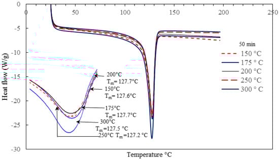 Differential scanning calorimetry (DSC) results showing the influence of barrel temperature.
