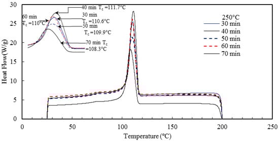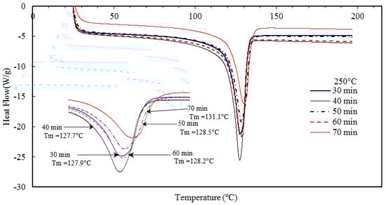 The temperature at which the last trace of crystal vanishes is defined as the melting temperature. Figure 17 and Figure 18, and Table 5 indicate that the barrel temperature has a minor effect on the melting and crystallization temperatures. Similar research was conducted by Ranjusha et al. [] who examined the influence of barrel temperature on the hybrid nanocomposites. They summarized that for injection molded nanocomposites, the barrel temperature has a significant effect on the thermal and mechanical stability of the samples. Bociaga et al. [] analyzed the influences of injection temperature, injection velocity, and mold temperature on injection molded high-density polyethylene. They concluded that the injection temperature and injection velocity have a slight influence on the improvement of the crystallinity of the nanocomposites. However, the increment of the mold temperature increased the degree of crystallinity. They suggested that with an increase in mold temperature, the polymer of interest has a longer time to cool down in the mold cavity and at high temperature, the polymer tends to form larger pores. As a result of this, the product has a higher degree of crystallinity []. The effect of residence time on the melting and crystallization temperature, and degree of crystallization is presented in Figure 19 and Figure 20 and Table 6.