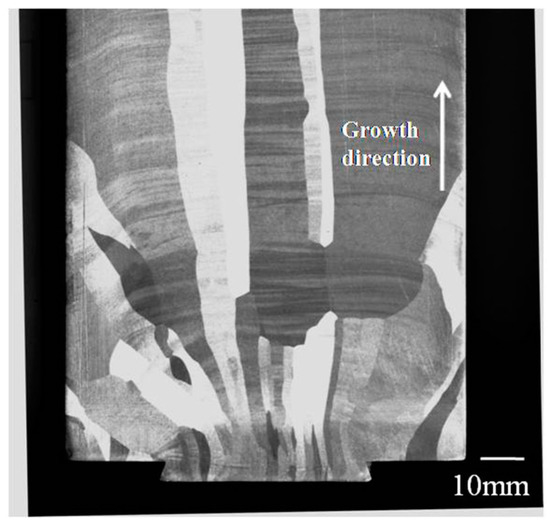 To date, a number of studies have been done to investigate the ECAP processes of pure aluminum and high purity aluminum in both experiments and simulations, amongst which some factors such as extrusion route, extrusion passes, and die angles were studied more frequently [8,9,10,11,12,13,14,15]. For general materials, the initial condition of the material is usually neglected due to less obvious particularity. However, it should be noted that in the process of segregation and purification during directional solidification to get 99.999% purity aluminum, it is easy to form a nearly-consistent orientation relationship (growth along [100] direction) and to form coarse columnar grains with diameter up to several centimeters, as shown in Figure 1. These unusual coarse grains can result in substantial decrease of original grain boundaries in cast ingot, and also lead to smaller misorientations among grains. The influence from the above features cannot be neglected in ECAP processes.