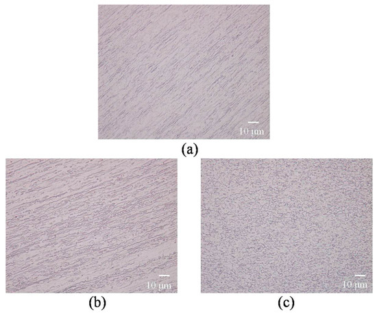 Metallographies of XZ plane after different ECAP passes: (a) 1 pass; (b) 8 passes; (c) 16 passes.