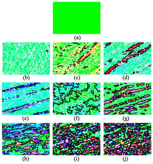 Grain orientation maps after different ECAP passes: (a) 0 passes; (b) 1 pass; (c) 2 passes; (d) 4 passes; (e) 5 passes; (f) 8 passes; (g) 12 passes; (h) 14 passes; (i) 15 passes; (j) 16 passes.