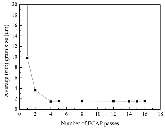 According to some previous studies about then ECAP process of fine polycrystalline material, the equilibrium state can be obtained by only eight passes (equivalent strain of 8.0), and further deformation to 12–16 passes cannot induce more changes in the microstructure [29,30,31]. Therefore, in comparison with polycrystalline materials, due to the lack of interruption on the activity of the dislocations from original grain boundary, the refinement efficiency of a single crystal in the earlier stage is poor, and 15 passes (equivalent strain of 13.05) are necessary to reach the equilibrium state of the microstructure. Therefore, it is believed that the extremely coarse initial grains and highly uniform grain orientation are not conducive to the accumulation of strain energy. The initial state of high purity aluminum ingot has a significant effect on the refining efficiency of ECAP process. In the future, we will further investigate the influence of different routes on the refinement efficiency of single crystal.