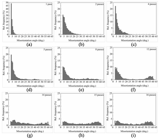 Distribution of boundary misorientation angles after different ECAP passes: (a) 1 pass; (b) 2 passes; (c) 4 passes; (d) 5 passes; (e) 8 passes; (f) 12 passes; (g) 14 passes; (h) 15 passes; (i) 16 passes.