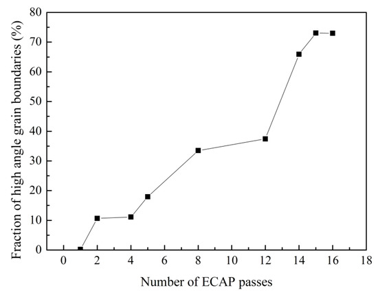 Fraction of high angle grain boundaries after different numbers of passes.