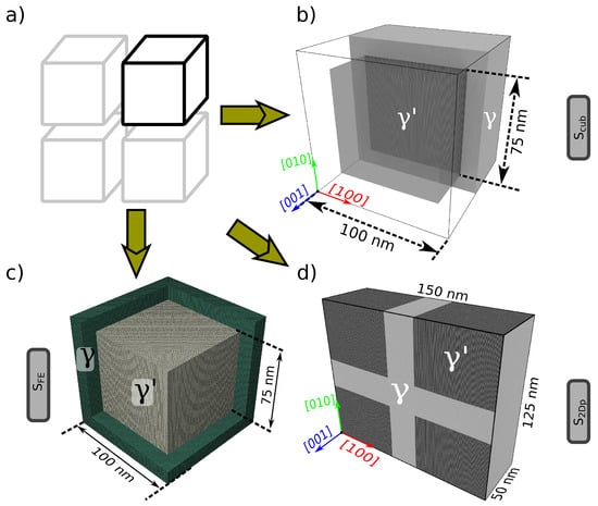 The idealized samples (see Figure 1) are motivated from the periodic arrangement of perfect cube-shaped particles embedded in a γ matrix as shown in Figure 1a. Such sample setups, or slightly modified versions thereof, are regularly used in atomistic (e.g., [23,24]), mesoscale (e.g., [25,26]) and continuum scale (e.g., [27,28]) simulations. The first atomistic sample, S, replicates a perfect cube of size 75 × 75 × 75 nm, surrounded by a γ channel of width 25 nm. The dimensions of the simulation box are 100 × 100 × 100 nm, with periodic boundary conditions (PBCs) imposed along all three directions (see Figure 1b).