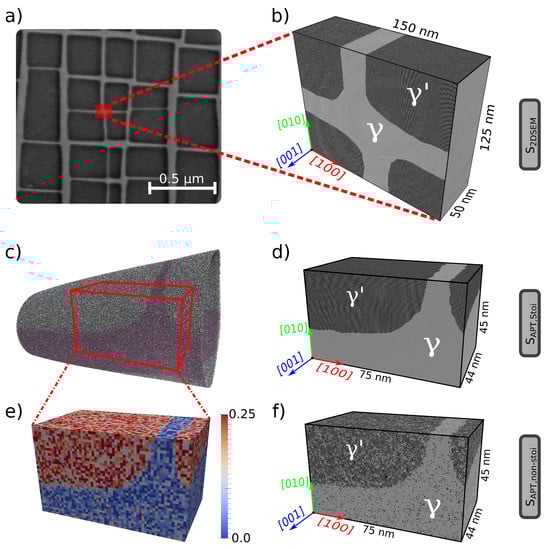 Simulation setup of the realistic samples used in the current work. (a) SEM-micrograph of a Ni-base superalloy Astra1 with the γ/ microstructure [31]. The atomistic sample corresponds to the region of interest marked in red; (b) SEM micrograph-informed quasi-2D atomistic sample with dimensions identical to sample S2p in Figure 1d. The channel thickness is 25 nm, and PBCs are imposed only along the thickness of the sample; (c) Atom probe tomography (APT) dataset with only Re (magenta), Ni (grey) and Al (black) atoms shown. Only the cuboidal region marked in red is used for further sample generation; (d) APT-informed stoichiometric atomistic sample; (e) Local concentration of Al in the region of interest in the APT sample; (f) APT-informed non-stoichiometric atomistic sample using the local concentrations of Al and Ni in the original APT data. Color code (for the atomistic simulation samples): Ni atoms are colored grey, whilst the Al atoms are colored black.