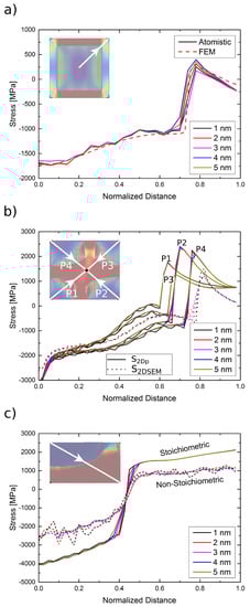 Stress profile (stress component ) along an internal face diagonal in the different samples. The path used in each sample is marked in white in the corresponding sample (see inset). (a) Atomistic sample S and FEM sample S; (b) Atomistic samples S and S; four different paths are used in sample S. Since the corresponding paths are identical in sample S, only one path is shown. (c) APT-informed stoichiometric sample S and non-stoichiometric sample S. For all atomistic samples, stress profiles were obtained by extracting atoms inside a cylinder along the path considered. Results for five different cylinder radii ( nm) are shown.