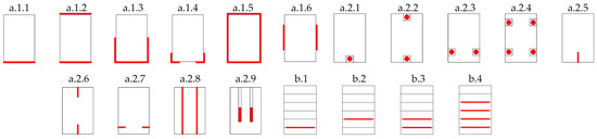 Figure 1 offers a general summary of the different layouts of FRP fabrics and pultruded laminates and rods commonly used in previous works. Layouts a.1 correspond to an external positioning of the reinforcement, visible from the outside, while provisions a.2 correspond to slots placed in the element. On the other hand, layouts b correspond to wooden beams reinforced with the element embedded during the laminate process in the case of glulam beams.