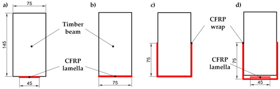 - Longitudinal reinforcement (LR): CFRP pultruded laminate was placed on the bottom side of the wooden beam, considering two different widths: partial, designated LR-P; and full, LR-F.