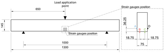Schematic representation of the 3-point bending test and location of the strain gauges at the beam faces (distances in mm).