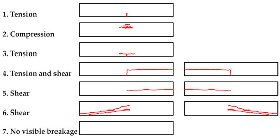 Fractures in the specimens were classified according to the seven types considered in the studies of De la Rosa et al. [32] and shown in Figure 4.