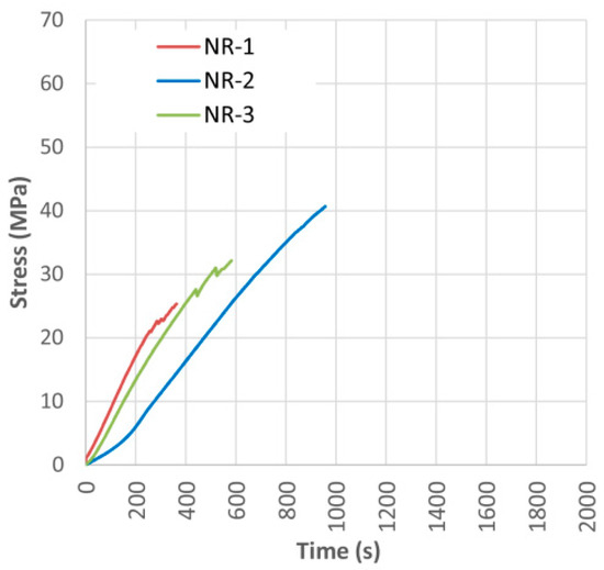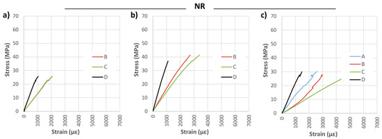 Stress against strain during bending tests: (a) NR-1; (b) NR-2; and (c) NR-3.