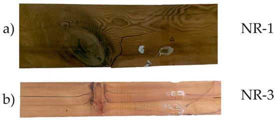 Figure 7 shows the bending stress against the strains measured by the strain gauges placed on the specimens, in each case. Clearly seen is a remarkable dispersion in the measured strains, due to defects near the strain gauges and the heterogeneity of the wood. Because of the positions of these defects, the strain gauge—A, for NR-1 and NR-2 beams, could not properly measure the strains. For beam NR-3, despite a low fiber deviation, the measured strains were notably affected by the large knot viewed in Figure 6.